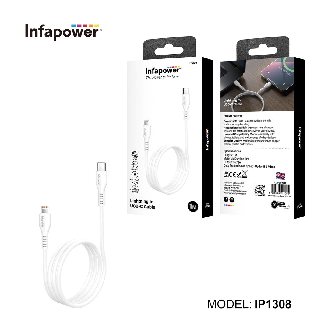 Infapower Lightning to USB-C Cable 1m Compact Lightning cable ideal for travel, desks and everyday...