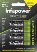 Infapower rechargeable batteries now contain a low self-discharge technology. Compared to standard rechargeables, once charged they can be stored for much longer periods