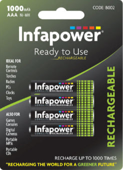 Login to View PricesInfapower high capacity AAA 1000mAh batteries are now Ready to Use* and Stays Charged Longer** giving maximum performance. Recharges up to 1,000 times. Ideal for high drain appliances e.g. digital cameras, portable MP3’s, game consoles, toys and personal CD’s etc.