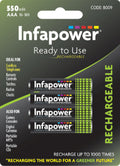 Login to View PricesInfapower AAA 550mAh batteries are now Ready to Use* and Stays Charged Longer** offering great value for money.They can be recharged up to 1,000 times. Ideal for remote controls, radios, cordless telephones, torches, PC’s, clock’s, toys, etc.